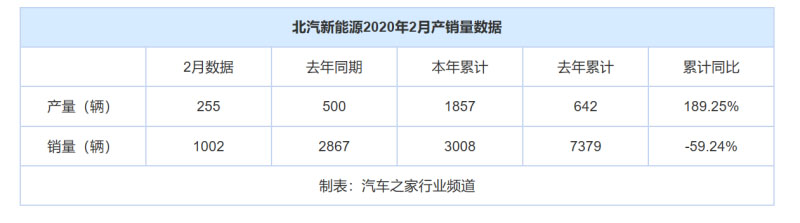 春節(jié)假期影響消除后,新冠肺炎疫情對于汽車行業(yè)的沖擊開始顯現(xiàn),新能源領域也不能幸免。根據(jù)北汽新能源最新發(fā)布的產銷數(shù)據(jù),2月銷量為1002輛,較去年同期的2867輛減少65%。降幅比1月(-55.54%)降幅進一步擴大。1-2月,北汽新能源累計銷量為3008輛,同比減少59.24%。