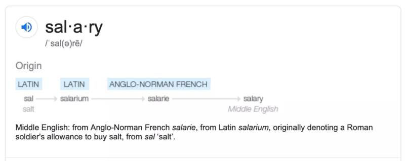 英語中的“to be worth one’s salt”一詞的意思是某人有能力,對得起他們掙的錢。據(jù)說這句話起源于古羅馬,士兵有時(shí)會(huì)得到鹽作為報(bào)酬或購買鹽的津貼。其實(shí)英語“Salary” (工資)這一詞來源于拉丁語 “salarium”,最初就是指士兵買鹽的津貼。