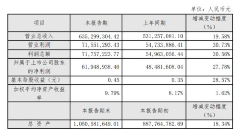 據(jù)了解,報(bào)告期內(nèi),實(shí)現(xiàn)營(yíng)業(yè)收入635,299,304.42元,較上年同期增長(zhǎng)19.58%;實(shí)現(xiàn)營(yíng)業(yè)利潤(rùn)71,551,293.43元,較上年同期增長(zhǎng)30.73%;實(shí)現(xiàn)利潤(rùn)總額71,757,223.77元,較上年同期增長(zhǎng)30.56%;實(shí)現(xiàn)歸屬于上市公司股東的凈利潤(rùn)61,948,938.46元,較上年同期增長(zhǎng)27.78%。