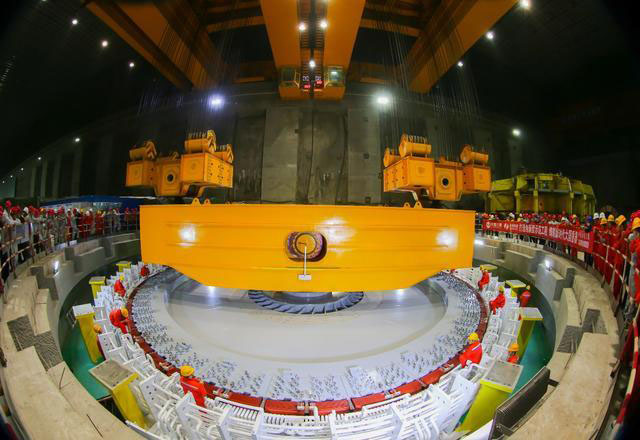 12月16日上午9時,隨著一聲哨響,烏東德水電站7號機組發(fā)電機轉(zhuǎn)子從右岸地下電站安裝間緩緩起吊,10時 20分,重達(dá)2062.6噸的"龐然大物"精準(zhǔn)落入機坑。這個落戶烏東德水電站的發(fā)電機組轉(zhuǎn)子是目前世界上在建水電站中單機容量最大的機組吊裝件。轉(zhuǎn)子順利吊裝,標(biāo)志著機組安裝全面步入總裝階段。