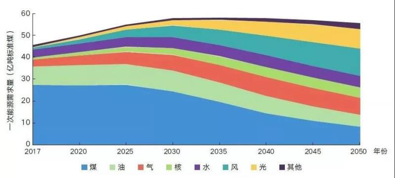 相比之下,化石能源需求量已進(jìn)入平臺(tái)期,2025年后將快速下降?;茉葱枨罅吭?025年前后達(dá)到峰值,峰值為43億噸標(biāo)準(zhǔn)煤。煤炭需求量仍處于峰值平臺(tái)期,占一次能源需求的比重持續(xù)下降。2020-2025年煤炭需求量約為27億~28億噸標(biāo)準(zhǔn)煤,占一次能源需求的比重在2025年降至50%,比2017年下降近10個(gè)百分點(diǎn);2025年后加速下降,2035年降至34%~36%,2050年降至15%~19%。