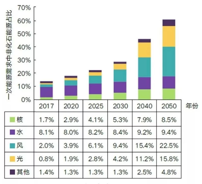 能源清潔化率2050年將達(dá)到50%以上,2025年前水能仍是最主要的非化石能源品種,2030年后風(fēng)能將成為最主要的非化石能源品種,2040年后太陽(yáng)能將成為第二大非化石能源品種。