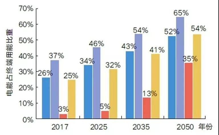建筑部門(mén)是目前電氣化水平最高的部門(mén),未來(lái)提升潛力也最大,電能占比將從2017年37%提高到2035年54%,2050年進(jìn)一步提升到65%。