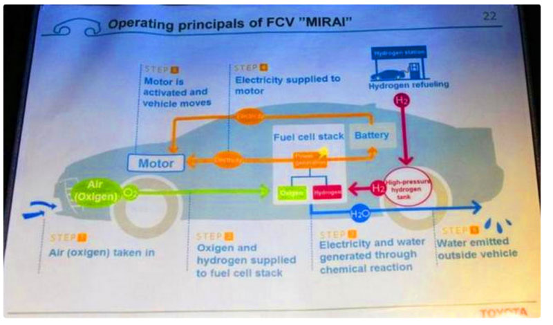 644km,聽(tīng)到這個(gè)數(shù)字相信很多朋友估計(jì)都會(huì)有一些小小的激動(dòng),畢竟咱們國(guó)內(nèi)續(xù)航里程最高的電動(dòng)車(chē)差不多也就四五百公里了,而這臺(tái)車(chē)一來(lái)就是600多公里,這著實(shí)調(diào)動(dòng)了人們的興趣。而說(shuō)到這臺(tái)豐田Mirai的原理其實(shí)也很簡(jiǎn)單,它利用空氣中的氧氣(綠色)以及氣罐內(nèi)的氫氣(紅線)在發(fā)電裝置內(nèi)發(fā)生反應(yīng),產(chǎn)生的電能(橙線)輸送給電動(dòng)機(jī)用于驅(qū)動(dòng)車(chē)輛,剩余的電能則儲(chǔ)存在電池中,用于車(chē)輛急加速或?yàn)檐?chē)上的用電設(shè)備供電?;瘜W(xué)反應(yīng)之后產(chǎn)生的水(藍(lán)線)直接排除車(chē)外即可。
