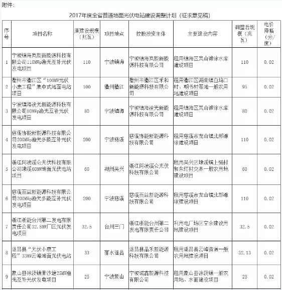 浙江省發(fā)展改革委關(guān)于2017年度全省普通地面光伏電站建設(shè)調(diào)整計(jì)劃公開征求意見的公告