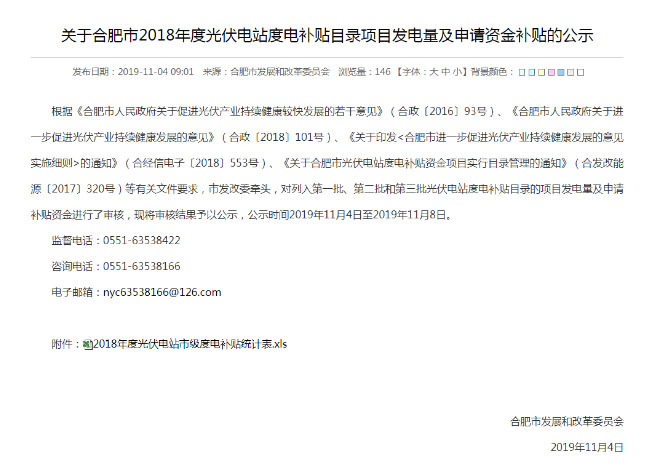 中國儲能網訊:11月4日,合肥省發(fā)改委發(fā)布關于合肥市2018年度光伏電站度電補貼目錄項目發(fā)電量及申請資金補貼的公示,由市發(fā)改委牽頭,對列入第一批、第二批和第三批光伏電站度電補貼目錄的項目發(fā)電量及申請補貼資金進行了審核,現(xiàn)將審核結果予以公示,公示時間2019年11月4日至2019年11月8日。據公告顯示光伏補貼共計4.38億。