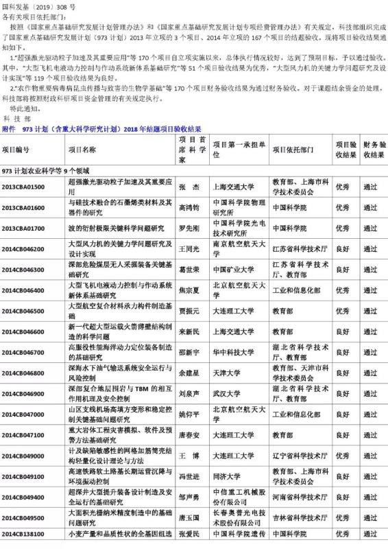 科技部關(guān)于發(fā)布國(guó)家重點(diǎn)基礎(chǔ)研究發(fā)展計(jì)劃(含重大科學(xué)研究計(jì)劃)2018年結(jié)題項(xiàng)目驗(yàn)收結(jié)果的通知