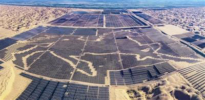 在庫(kù)布其沙漠腹地,178萬(wàn)塊太陽(yáng)能光伏板整齊排列,宛若一片“藍(lán)色海洋”,“金沙”“藍(lán)?!薄熬G地”六個(gè)大字矗立在光伏板旁。來(lái)自達(dá)拉特旗的資料顯示,基地位于庫(kù)布其沙漠中段,建設(shè)規(guī)模200萬(wàn)千瓦,占地面積10萬(wàn)畝,總投資150億元,目前該基地也是國(guó)內(nèi)沙漠地區(qū)最大集中連片光伏基地。項(xiàng)目全部建成后,年發(fā)電量可達(dá)40億度,有效治沙20萬(wàn)畝,年減排二氧化碳320萬(wàn)噸,節(jié)約標(biāo)準(zhǔn)煤135萬(wàn)噸。