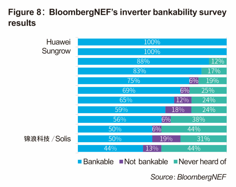 中國儲能網(wǎng)訊:近期,彭博新能源財經(jīng)BNEF發(fā)布《2019年組件與逆變器融資價值報告》(Solar Module & Inverter Bankability 2019),主要針對全球知名光伏產(chǎn)業(yè)制造商的融資價值展開調(diào)研。憑借穩(wěn)健的財務(wù)表現(xiàn)、可靠的產(chǎn)品質(zhì)量、良好的企業(yè)商譽,華為、陽光、錦浪、東芝三菱位列逆變器可融資性排名亞洲四強品牌。