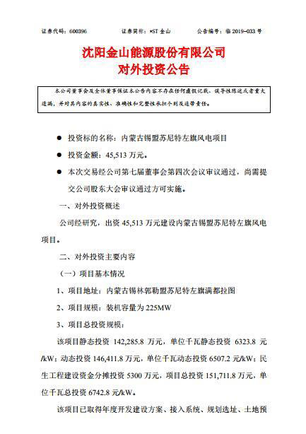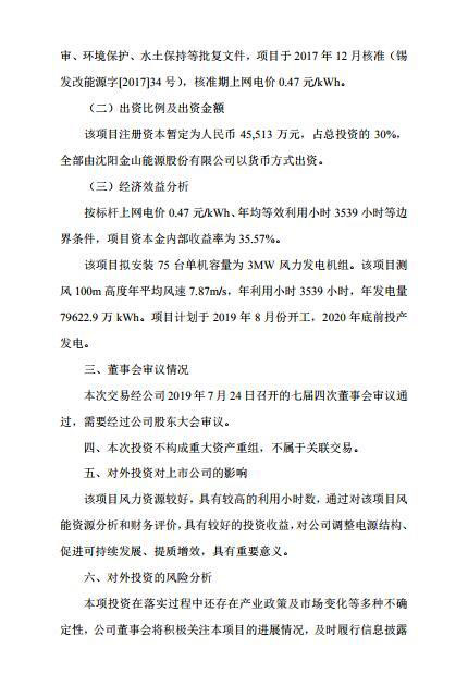 中國儲能網(wǎng)訊:沈陽金山能源股份有限公司發(fā)布公告:公司經(jīng)研究,出資45,513萬元建設內蒙古錫盟蘇尼特左旗風電項目。該項目注冊資本暫定為人民幣45,513萬元,占總投資的30%,全部由沈陽金山能源股份有限公司以貨幣方式出資。預計項目資本金內部收益率為35.57%。項目計劃于2019年8月份開工,2020年底前投產(chǎn)發(fā)電。