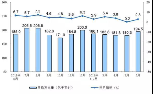 6月份,發(fā)電5834億千瓦時,同比增長2.8%,增速比上月加快2.6個百分點;日均發(fā)電194.5億千瓦時,比上月增加14.2億千瓦時。上半年,發(fā)電3.4萬億千瓦時,增長3.3%,增速較一季度放緩0.9個百分點。