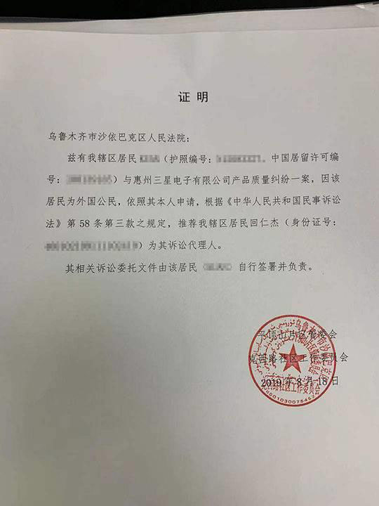 “三星note7自燃案件”原告回仁杰作為代理人的證明。 采訪對象供圖
