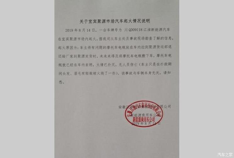 8月14日,江淮純電動(dòng)SUV自燃起火事件的監(jiān)控視頻在社交媒體上曝光,目前江淮官方已針對(duì)該起事件進(jìn)行了回應(yīng),表示本次事故未造成人員傷亡,具體事故原因?yàn)檐噧?nèi)運(yùn)載的有問題的摩托車電瓶發(fā)生自燃,從而導(dǎo)致車內(nèi)起火,與車輛本身無(wú)關(guān)。