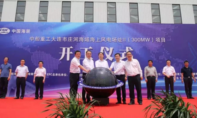 6月26日,中船重工大連市莊河海域海上風電場址Ⅱ(300MW)項目在中船重工莊河海上風電產(chǎn)業(yè)園舉行開工儀式。