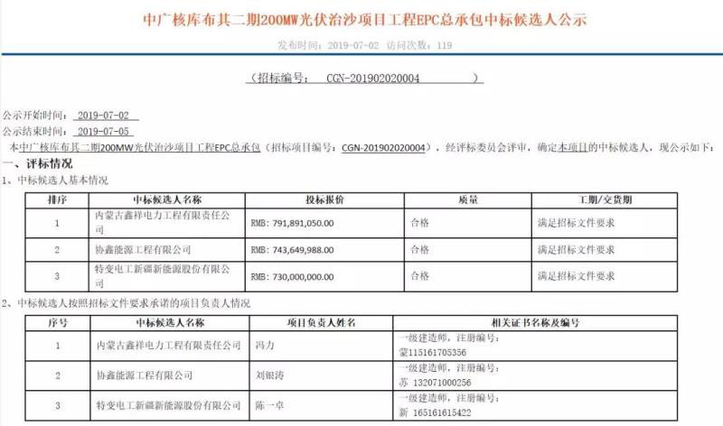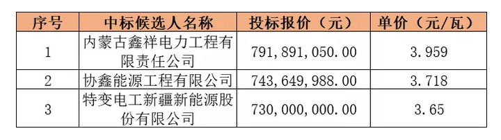 7月2日,中廣核庫(kù)布其二期200MW光伏治沙項(xiàng)目工程EPC總承包公示中標(biāo)候選人,內(nèi)蒙古鑫祥電力工程有限責(zé)任公司以總報(bào)價(jià)791,891,050.00元、單價(jià)3.959元/瓦位列第一中標(biāo)候選人。值得一提的是,內(nèi)蒙古鑫祥電力工程有限責(zé)任公司為三位中標(biāo)候選人中報(bào)價(jià)最高者,具體如下: