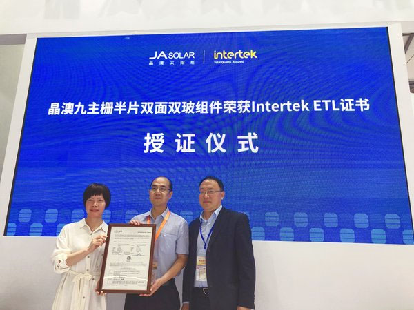 中國(guó)儲(chǔ)能網(wǎng)訊:6月4日,SNEC第十三屆(2019)國(guó)際太陽(yáng)能光伏與智慧能源(上海)展覽會(huì)暨論壇開(kāi)幕,全球領(lǐng)先的高性能光伏產(chǎn)品制造商之一晶澳太陽(yáng)能有限公司(以下簡(jiǎn)稱“晶澳太陽(yáng)能”)所展出的九主柵半片雙面雙玻單晶組件獲得 Intertek天祥集團(tuán)(以下簡(jiǎn)稱“Intertek”)頒發(fā)的 UL61215 及 UL61730 標(biāo)準(zhǔn)的 ETL 證書(shū)。晶澳太陽(yáng)能的常規(guī)雙面雙玻單晶組件早在今年2月便已經(jīng)獲得 ETL 美標(biāo)新標(biāo)證書(shū),此次九主柵半片雙面雙玻單晶組件的獲證,更體現(xiàn)出晶澳太陽(yáng)能領(lǐng)先的技術(shù)實(shí)力和可靠的產(chǎn)品質(zhì)量?jī)?yōu)勢(shì)。授牌儀式在晶澳太陽(yáng)能展臺(tái)隆重舉行,晶澳太陽(yáng)能董事牛新偉博士、質(zhì)量部總監(jiān)黃淑玟女士、Intertek電子電氣事業(yè)部華東區(qū)銷售總監(jiān)李一峰先生等雙方代表出席了儀式。