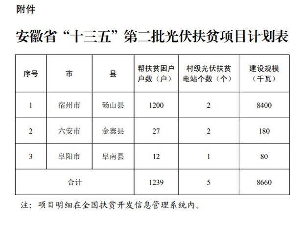 一、下達我省項目計劃。本次計劃下達碭山、金寨、阜南3個縣光伏扶貧項目,共5個村級光伏扶貧電站,總裝機規(guī)模8660千瓦,幫扶建檔立卡貧困戶1239 戶(見附件)。