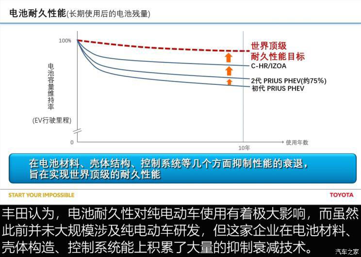 目前,豐田汽車在電池材料、殼體構(gòu)造、控制系統(tǒng)上的技術(shù)積累已經(jīng)達到全新高度,預(yù)計在2020年投放市場的豐田C-HR EV中,電池抑制衰減技術(shù)將會再度大幅提升。