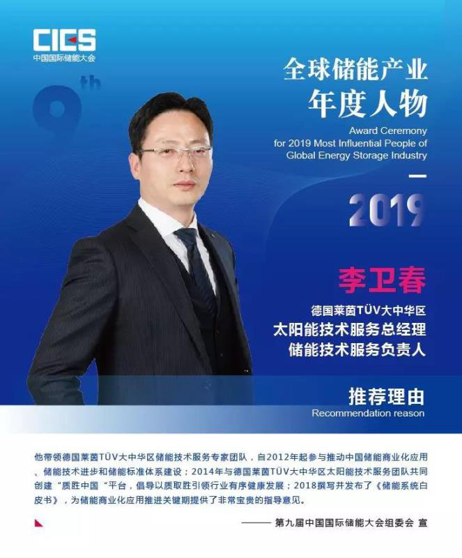 在當(dāng)天另一項(xiàng)“2019全球儲(chǔ)能產(chǎn)業(yè)十大年度人物”頒獎(jiǎng)中,TüV萊茵大中華區(qū)太陽能服務(wù)總經(jīng)理、儲(chǔ)能技術(shù)服務(wù)負(fù)責(zé)人李衛(wèi)春先生獲得殊榮。