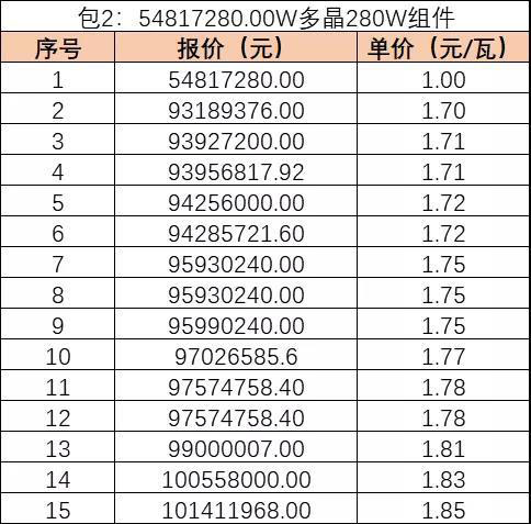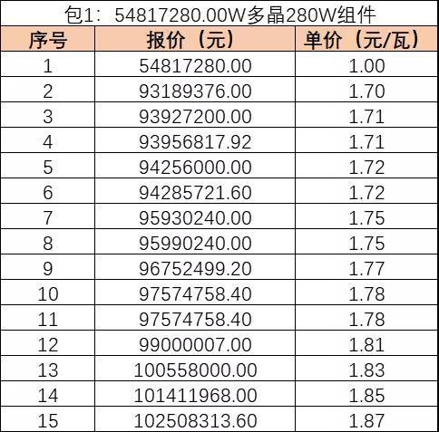 該項目組件交貨期為2019年7月-9月。據(jù)了解,其中,由某企業(yè)報出的最低價1元/瓦因信息填寫錯誤已澄清。去除該報價后,最低報價1.70元/瓦,最高報價1.87元/瓦,均價在1.76元/瓦左右。該價格為人民幣含稅價。