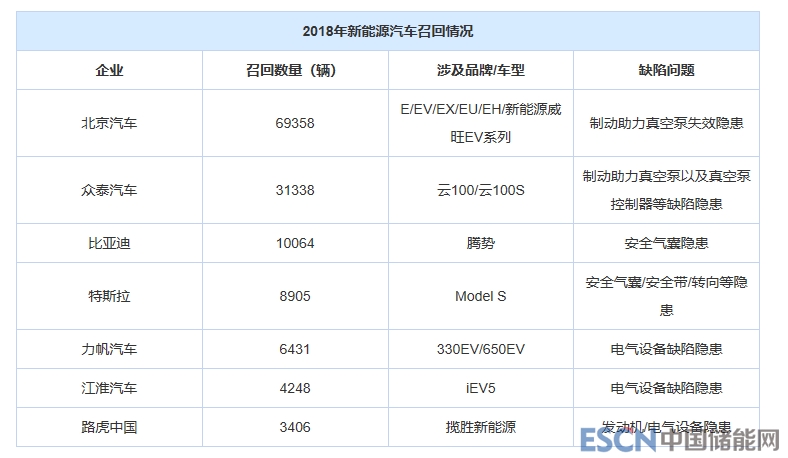 中國儲能網(wǎng)訊:因起火事故頻繁曝光,新能源汽車安全及召回等相關(guān)問題引起社會廣泛關(guān)注。在此背景下,國家市場監(jiān)督管理總局啟動針對新能源汽車的缺陷調(diào)查。2018年,北汽、比亞迪、眾泰等7家企業(yè)先后共實施召回10次,涉及13.38萬輛新能源汽車。其中,受調(diào)查影響召回12.14萬輛,占2018年新能源召回總量的91%。召回車輛涉及的問題主要有動力電池、氣囊、制動、電氣設(shè)備等。