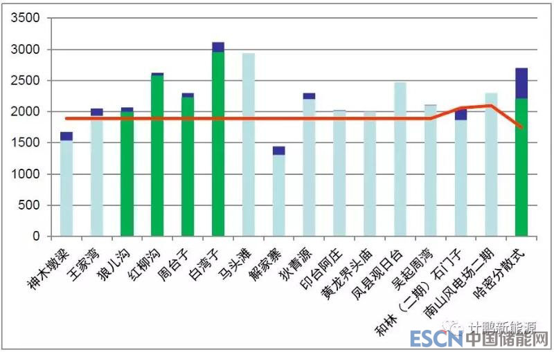 其發(fā)電小時(shí)數(shù)與同期集中式風(fēng)電滿發(fā)小時(shí)數(shù)對(duì)比圖如下圖所示:其中深藍(lán)色表示限電小時(shí)數(shù),紅色曲線表示同期集中式風(fēng)電滿發(fā)小時(shí)數(shù)。從圖中可以看出:分散式風(fēng)電就地消納的優(yōu)勢(shì)。其中綠色標(biāo)注的狼兒溝、紅柳溝、周臺(tái)子、白灣子及哈密分散式的接入方式與國(guó)能發(fā)新能[2017] 3號(hào)文件要求的接入電壓等級(jí)一致,具有參考價(jià)值。
