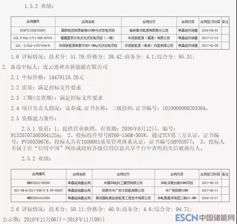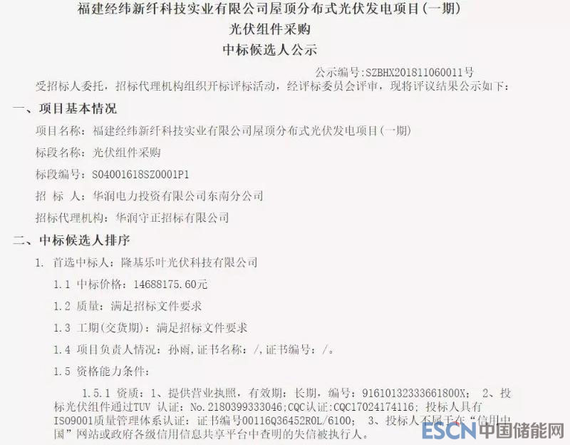 11月6日,華潤電力公示了福建經(jīng)緯新纖科技實業(yè)有限公司屋頂分布式光伏發(fā)電項目(一期)光伏組件采購的中標(biāo)候選人,隆基樂葉以14688175.60元報價成為首選中標(biāo)人,連云港神舟新能源有限公司以14478118.20元的中標(biāo)價格成為備選中標(biāo)人。