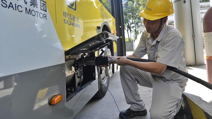 黃白相間的車身,加進(jìn)去的是氫,排出來(lái)的是水,最長(zhǎng)續(xù)駛里程可達(dá)560公里。今天上午,上海首條燃料電池公交線路在嘉定上線,6輛申沃牌燃料電池城市客車將投入嘉定114路的運(yùn)營(yíng)。