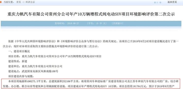 力帆汽車計劃通過租賃車和家江蘇常州工廠,建設(shè)一個年產(chǎn)10萬輛的增程式純電動SUV項目。近日,江蘇環(huán)保公眾網(wǎng)發(fā)布了環(huán)評公示,公示顯示,該項目總投資超18億元,預計于2019年8月投產(chǎn)。