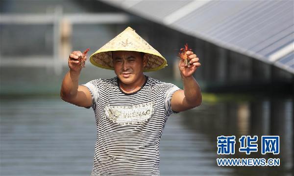 ↑8月9日,在江蘇省金湖縣銀涂鎮(zhèn),村民展示魚塘內(nèi)養(yǎng)殖的小龍蝦。新華社記者 李雨澤 攝