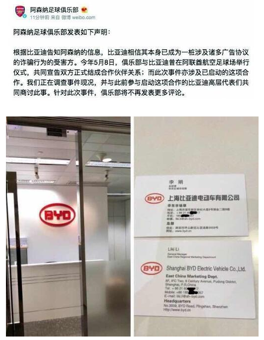 事發(fā)后,比亞迪官方微博刪除了與阿森納相關(guān)的全部信息,也未提及雙方是否繼續(xù)合作。