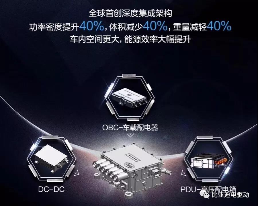 比亞迪充配電三合一采用電力電子集成技術(shù),將車載電源(OBC+DC/DC轉(zhuǎn)換器)與配電箱(PDU)深度集成,把車載電源產(chǎn)品做到“輕量化、小型化、集成化及低成本”。