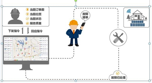 運(yùn)維方面,從成本角度考慮,村級扶貧電站不適合派人長期駐守運(yùn)維, 故障的及時(shí)發(fā)現(xiàn)、分析、解決需要制定靈活高效的運(yùn)維方案。光伏行業(yè)先進(jìn)企業(yè)通過現(xiàn)代化物聯(lián)網(wǎng)技術(shù)、人工智能及大數(shù)據(jù)分析技術(shù),為光伏電站打造智慧大腦,實(shí)現(xiàn)電站實(shí)時(shí)監(jiān)測、智能分析和診斷、快速定位。此次示例設(shè)計(jì)方案中將電站接入智慧能源扶貧平臺,在實(shí)現(xiàn)以上功能基礎(chǔ)之外,增加智能派單功能,實(shí)現(xiàn)及時(shí)消缺,使得村級扶貧電站的運(yùn)維更加高效。