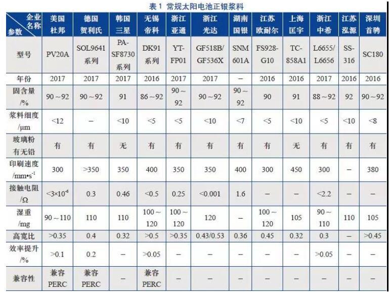 導(dǎo)電銀漿的品質(zhì)對太陽電池的電性能起著決定性作用,優(yōu)質(zhì)的導(dǎo)電銀漿是制造高效太陽電池的關(guān)鍵。雖然目前國內(nèi)企業(yè)生產(chǎn)的漿料市場占有率較低,但在國內(nèi)漿料生產(chǎn)商的努力下,國產(chǎn)漿料與進(jìn)口漿料的性能差距已經(jīng)較小,主要是穩(wěn)定性與品牌知名度還亟需提高。表1~表5列舉了國內(nèi)外漿料商為不同結(jié)構(gòu)太陽電池設(shè)計的最新正銀漿料的性能參數(shù)[20]。