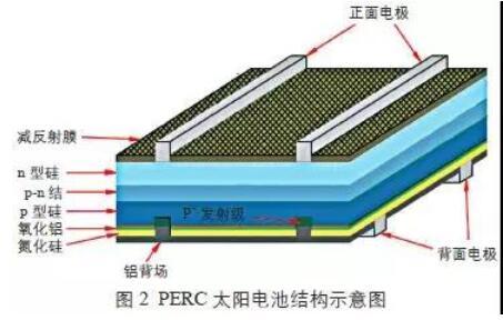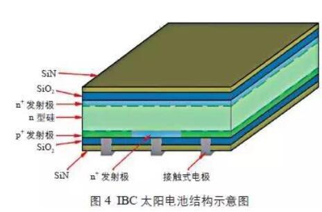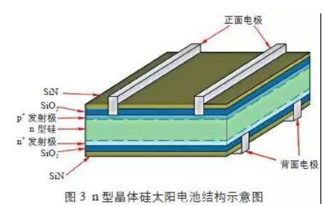 圖3為n型晶體硅太陽能電池結(jié)構(gòu)示意圖。n型晶體硅太陽能電池較p型晶體硅太陽電池具有少子壽命高、光致衰減小等優(yōu)點(diǎn),有更大的效率提升空間。同時,n型晶體硅太陽能電池還具有弱光響應(yīng)好、溫度系數(shù)低等優(yōu)點(diǎn)。