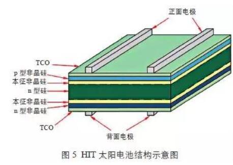 圖5為HIT太陽能電池( 異質(zhì)結(jié)太陽能電池)結(jié)構(gòu)示意圖[8-9]。HIT太陽能電池以高質(zhì)量超薄本征非晶硅層對晶體硅基底材料的兩面進(jìn)行鈍化,降低表面復(fù)合損耗,提高了器件對光生載流子的收集能力,從而形成高效的新型晶體硅太陽電池。其主要優(yōu)勢有[10-11]:1) 采用低溫技術(shù),整個燒結(jié)工藝可在200 ℃左右完成,減少能耗,降低成本;2) 光電轉(zhuǎn)換效率高;3) 穩(wěn)定性好,沒有形成B-O復(fù)合體而導(dǎo)致的光衰效應(yīng)。