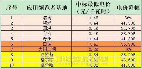 在2016年第二批領(lǐng)跑者基地中,烏海項(xiàng)目投出0.45元/千瓦時(shí)的最低電價(jià),令業(yè)界嘩然。但在補(bǔ)貼退坡及平價(jià)上網(wǎng)的倒逼下,這顯然不是終點(diǎn),第三批領(lǐng)跑者項(xiàng)目競(jìng)標(biāo)電價(jià)再度下探。據(jù)統(tǒng)計(jì),以標(biāo)桿上網(wǎng)電價(jià)為基準(zhǔn),第三批十個(gè)應(yīng)用領(lǐng)跑者項(xiàng)目最低中標(biāo)電價(jià)普降三成以上(詳見下表)。