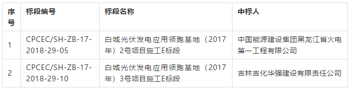 中國儲能網(wǎng)訊:中電投電力工程有限公司2018年度第二十九批招標(吉林白城白城光伏發(fā)電應用領跑基地2號項目施工E標段、3號項目施工E標段)通過招標評審,結(jié)果公示如下:
