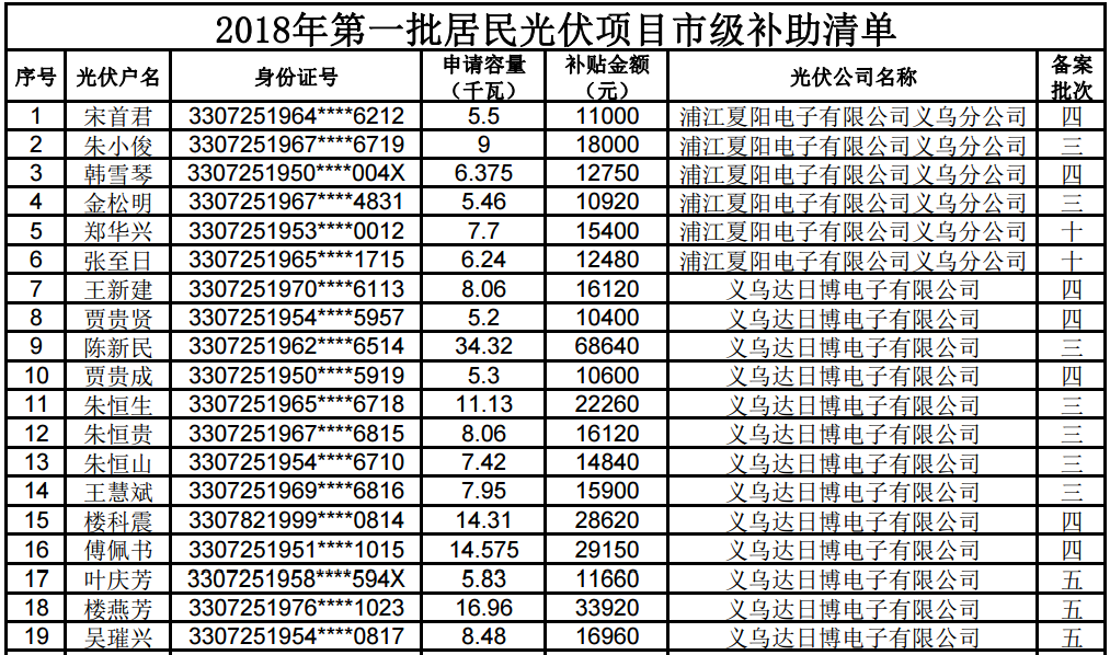 中國(guó)儲(chǔ)能網(wǎng)訊:昨日,義烏經(jīng)信委公示了義務(wù)2018年第一批居民光伏項(xiàng)目市級(jí)補(bǔ)助公告,根據(jù)《義烏市人民政府關(guān)于促進(jìn)光伏產(chǎn)業(yè)發(fā)展的實(shí)施意見(jiàn)》(義政發(fā)〔2015〕43號(hào))、《義烏市居民光伏項(xiàng)目市級(jí)補(bǔ)助資金申報(bào)細(xì)則》(義經(jīng)信能源〔2017〕7號(hào))等文件精神,現(xiàn)對(duì)我市2018年第一批居民光伏發(fā)電補(bǔ)助項(xiàng)目進(jìn)行公示,公示時(shí)間為一周,以下提供部分名單詳情。