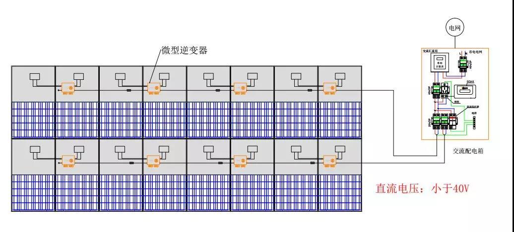 采用微型逆變器的光伏系統(tǒng),為全并聯(lián)電路設(shè)計,組件之間不再有電壓疊加,直流電壓小于60伏(不高于組件最高輸出直流電壓),徹底解決了由于高壓直流拉弧引起火災(zāi)的風(fēng)險,同時也解決了當(dāng)房屋起火時,因光伏電站而阻礙了施救的問題。