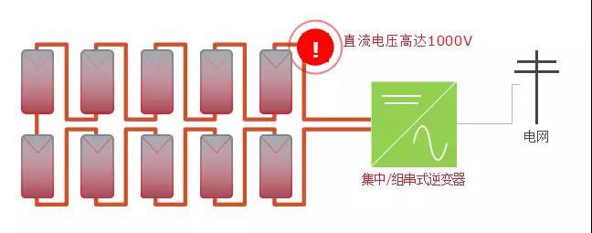 在傳統(tǒng)的組串式光伏系統(tǒng)中有兩大風(fēng)險的存在:高壓電弧風(fēng)險與火災(zāi)施救風(fēng)險。在傳統(tǒng)系統(tǒng)中,太陽能組件以串列方式排成陣列,整串線路電壓累計,一般可以達(dá)到600V~1000V的高壓。當(dāng)系統(tǒng)長年累月運(yùn)行,電線絕緣層腐蝕后電線容易裸露,非常容易產(chǎn)生直流電弧,擊穿空氣,引發(fā)火災(zāi)。