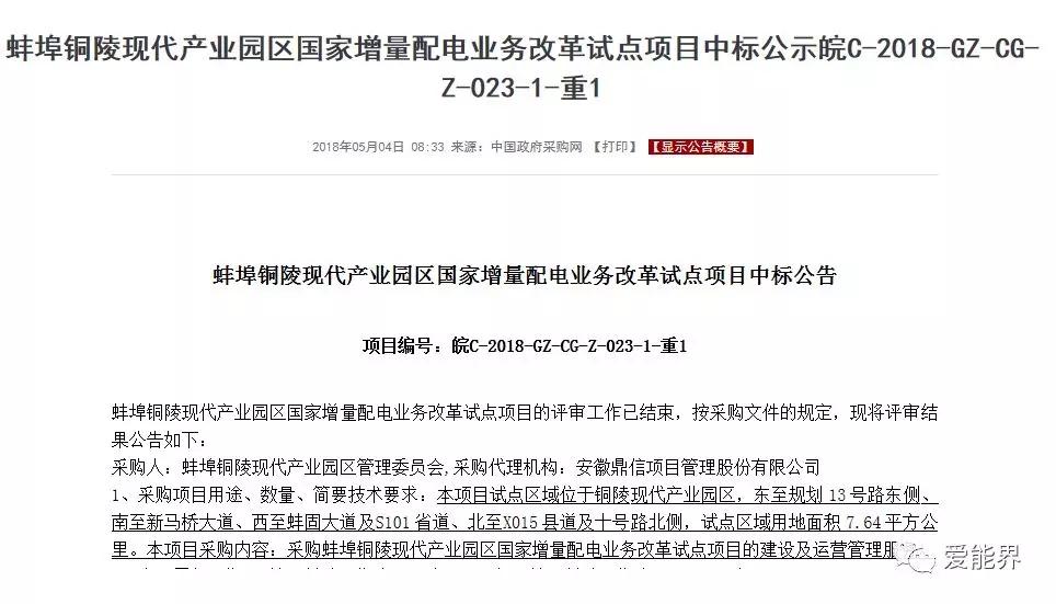 中國儲能網(wǎng)訊:中國政府采購網(wǎng)顯示,蚌埠銅陵現(xiàn)代產(chǎn)業(yè)園區(qū)國家增量配電業(yè)務改革試點項目,中標前三候選人均是電力設計院,第一中標候選人名稱為安徽省電力設計院有限公司與北京新奧新能能源投資有限公司聯(lián)合體,第二中標候選人為浙江省電力設計院有限公司,第三中標候選人為湖南省電力設計院有限公司。此次招標采購人為蚌埠銅陵現(xiàn)代產(chǎn)業(yè)園區(qū)管理委員會,采購內(nèi)容為蚌埠銅陵現(xiàn)代產(chǎn)業(yè)園區(qū)國家增量配電業(yè)務改革試點項目的建設及運營管理服務。