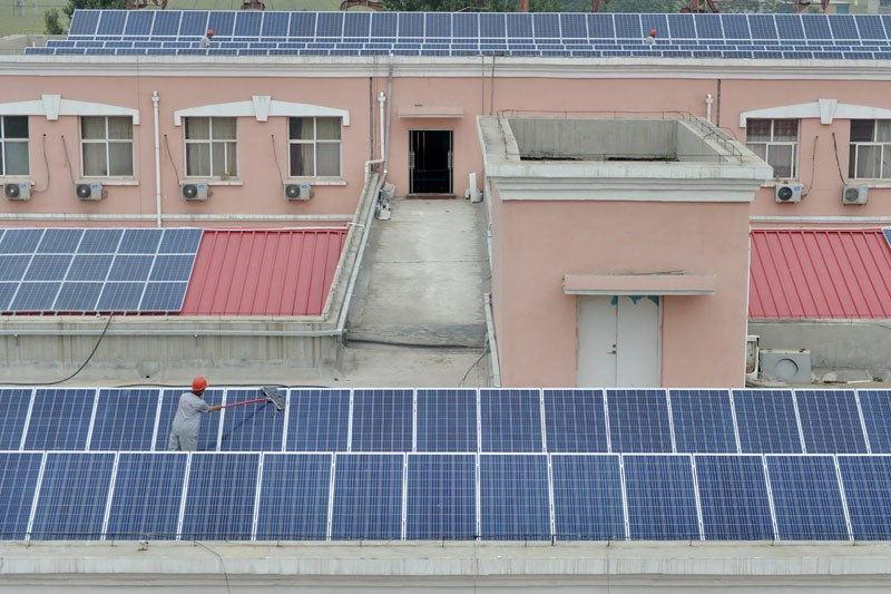 5月22日,工作人員在寧晉縣北河莊中心衛(wèi)生院屋頂光伏扶貧電站清理維護(hù)光伏板。
