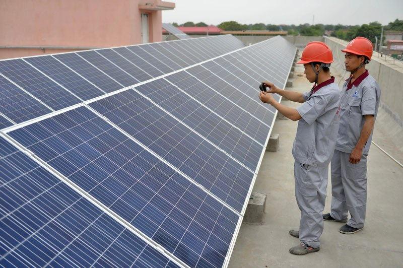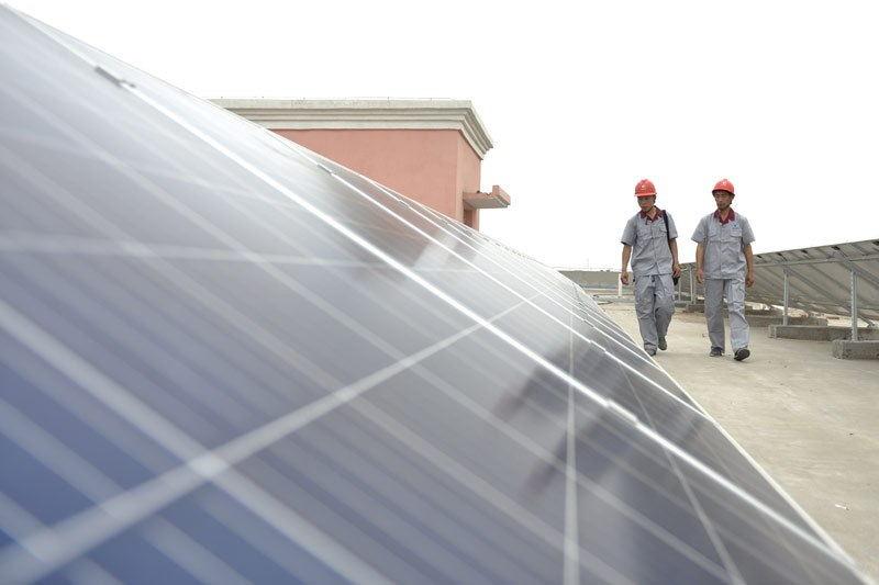 5月22日,工作人員在寧晉縣北河莊中心衛(wèi)生院屋頂光伏扶貧電站巡查。