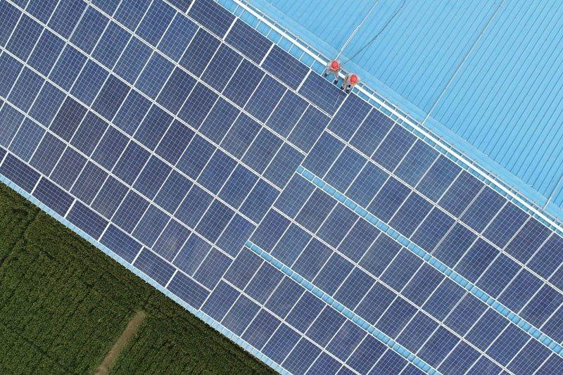5月22日無(wú)人機(jī)拍攝的寧晉縣河渠工業(yè)區(qū)一家工廠廠房屋頂?shù)墓夥鲐氹娬卷?xiàng)目。