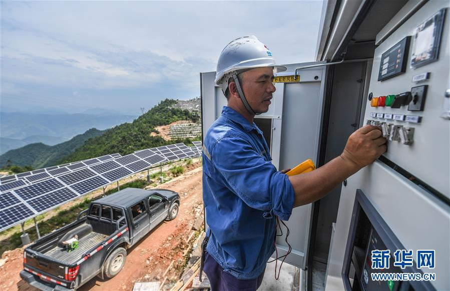 6月29日,工作人員在檢查剛剛投運的農(nóng)光互補光伏發(fā)電設(shè)備?!⌒氯A社記者 徐昱 攝