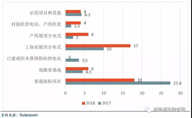 展望2018年,由于指標(biāo)管理政策的嚴(yán)格,已建成但無法獲取指標(biāo)的項目可能不再出現(xiàn),因此我們認(rèn)為需求端普通指標(biāo)項目(普通集中式、集中式扶貧、地面分布式)會有所下降大約18GW;領(lǐng)跑者基地規(guī)模會進(jìn)一步擴大,預(yù)計在6-8GW左右;分布式電站會延續(xù)高增長,預(yù)計有23-25GW;光伏扶貧力度將進(jìn)一步增強,預(yù)計有4GW,示范電站和其他項目預(yù)計4-5GW,因此2018年國內(nèi)裝機規(guī)模約為55-60GW,需求依然強勢。2017和2018年中國光伏新增裝機結(jié)構(gòu)對比見下表(單位:GW)。