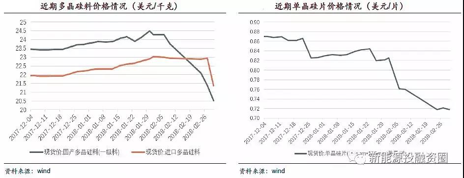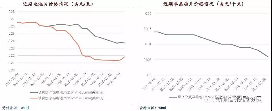2018年單晶硅片龍頭隆基股份三次調(diào)價,目前單晶硅片國內(nèi)報價4.55元/片、國外報價0.63美元,總降價達(dá)到0.85元/片。同時2018年1-2月份多晶硅價格呈現(xiàn)出明顯的“斷崖式下跌”走勢,2月初開始,多晶硅價格瞬間斷崖式下跌,2月底價格為12.46萬元/噸,降幅高達(dá)18.6%。2月均價12.96萬元/噸,環(huán)比下滑15.3%。電池片和組件的環(huán)節(jié)較為平穩(wěn),我們認(rèn)為經(jīng)過一季度的淡季,價格大幅調(diào)整后,在二季度即將迎來搶裝,各個環(huán)節(jié)價格趨于穩(wěn)定。