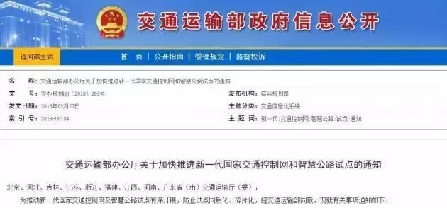 中國(guó)儲(chǔ)能網(wǎng)訊:近日,北京傳來大消息:交通運(yùn)輸部發(fā)出通知,決定在北京、河北、吉林、江蘇、浙江、福建、江西、河南、廣東九?。ㄊ校涌焱七M(jìn)新一代國(guó)家交通控制網(wǎng)和智慧公路試點(diǎn)。