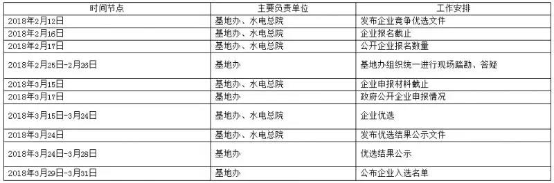 根據(jù)優(yōu)選工作初步安排,2018年1月15日編制完成優(yōu)選工作方案;2018年2月11日省發(fā)改委批復(fù)優(yōu)選工作方案;2018年2月12日公開優(yōu)選工作方案;2018年2月12日基地政府審定競爭優(yōu)選文件;2018年2月12日發(fā)布企業(yè)競爭優(yōu)選文件;2018年2月12-16日企業(yè)報(bào)名參選;2018年2月17日公布企業(yè)報(bào)名數(shù)量;2018年2月25-26日企業(yè)現(xiàn)場踏勘答疑;2018年3月15日企業(yè)申報(bào)材料提交截止;3月17日公布企業(yè)申報(bào)情況;2018年3月15-3月24日(10天)企業(yè)優(yōu)選;2018年3月24-28日(5天)優(yōu)選結(jié)果公示;2018年3月29-31日(3天)確認(rèn)公示結(jié)果,依程序發(fā)布基地入選名單。